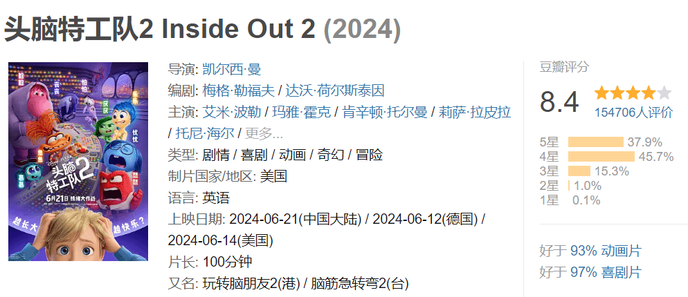 當觀眾發現,喜怒哀厭恐這些我們日常的情緒被擬人化,直觀地看到它們是怎樣操控我們情緒的起伏和波動後,第一波口碑效應發生了作用,很快票房也緊隨其後,《頭腦特工隊》全球票房8億美元,Metacritic和豆瓣評分為94分和8.8分,贏得風光體面。