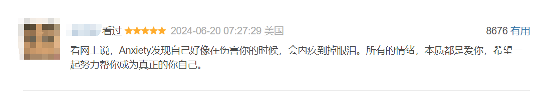 在社交媒體上,可以看到觀眾的集體反思,“東亞小孩光是聽到核心意識樹説我是一個很棒的人之類的台詞都會想哭” “愛自己,接納自我,擁抱所有的經歷與情緒”**“ 焦焦應該是個東亞人”“anxiety最後因為壓力過大在控制枱面前流淚的時候,joy説let it go。我真的哭死了。**學會和自己的各類情緒和平共處真的好難哦”你看,引發積極的思考,是一部文藝作品社會價值的體現。