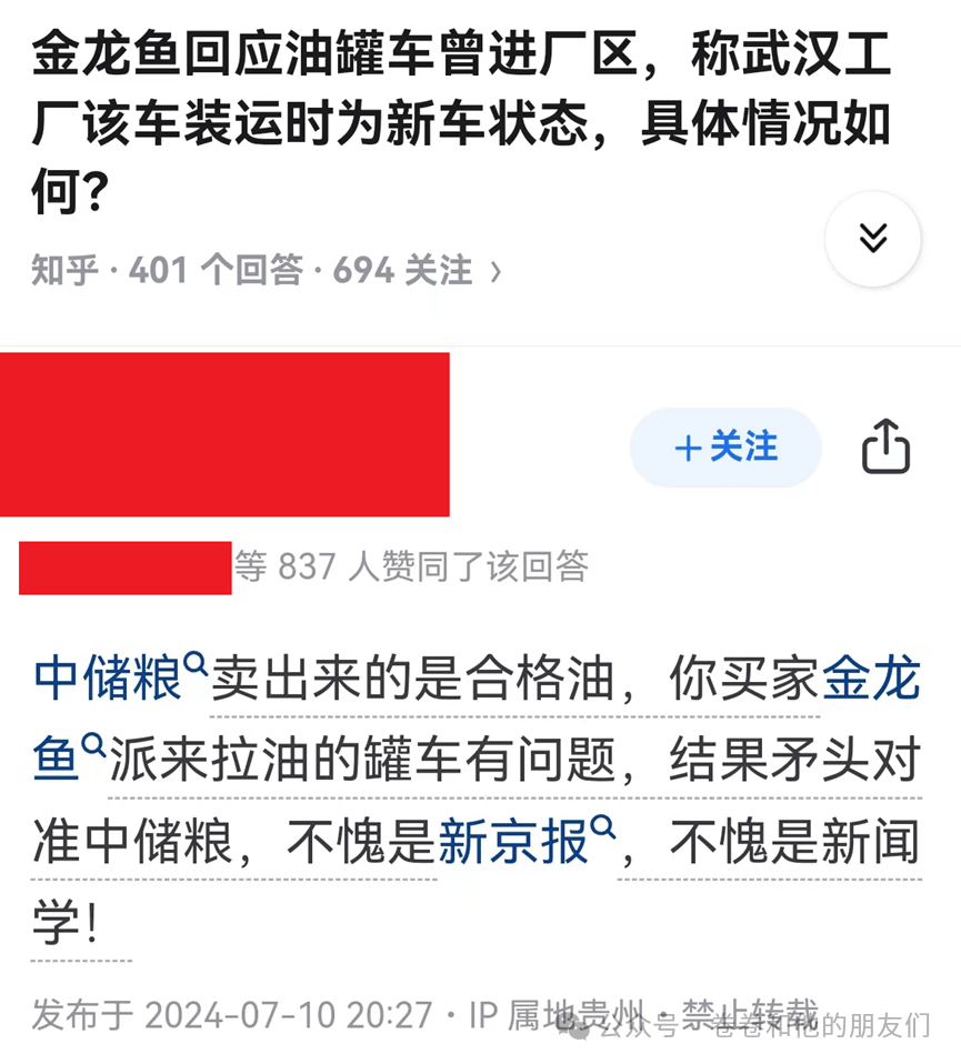 我倒無意為金龍魚辯護。根據網友的截圖,金龍魚先説公司用自己的專用車;高流的視頻發佈後,又回應車進廠區經過清洗和檢測。看起來前後矛盾的説法非常可疑。