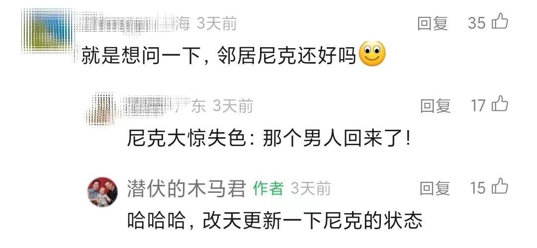 沒想到公號裏這位男二號的近況,牽動了很多瓜友的心,特別是最近聽説木馬爸爸帶娃回了德國後,**大家的第一反應是:尼克還好嗎?**看來大家都很關心他的安危。哈哈。