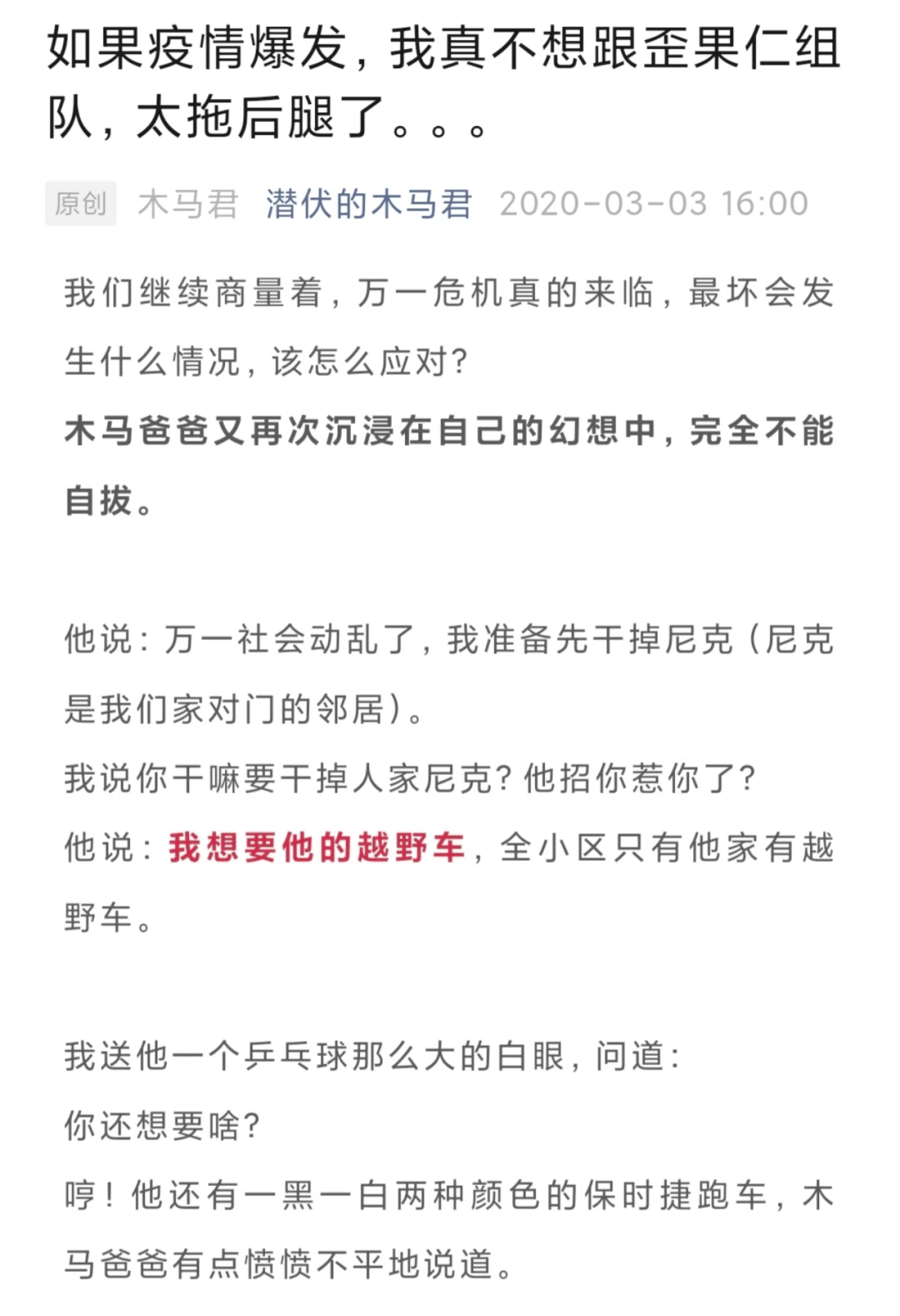 木馬爸爸説,那他先要把鄰居尼克幹掉,然後搶到他的槍和越野車,這一定是末日裏的搶手資源。