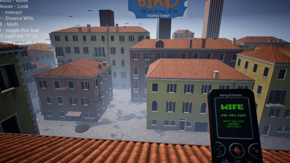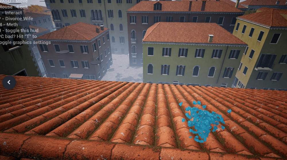 在主頁裏,玩家給遊戲打上的Tag是“模擬、休閒、教育”,而當你真正進入遊戲時,只會發現自己身處在一個數米高的屋頂,手頭上只有一部電話和一袋不知有什麼作用的藍色藥片,沒有任何額外提示。