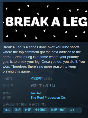 在7月1日上架Steam的免費遊戲《Break a Leg》(斷腿)就是如此。相信多數玩家在體驗過後,也只能把它勉強定義為一款“遊戲”,但卻很難在“遊戲”前加上更多的形容詞。