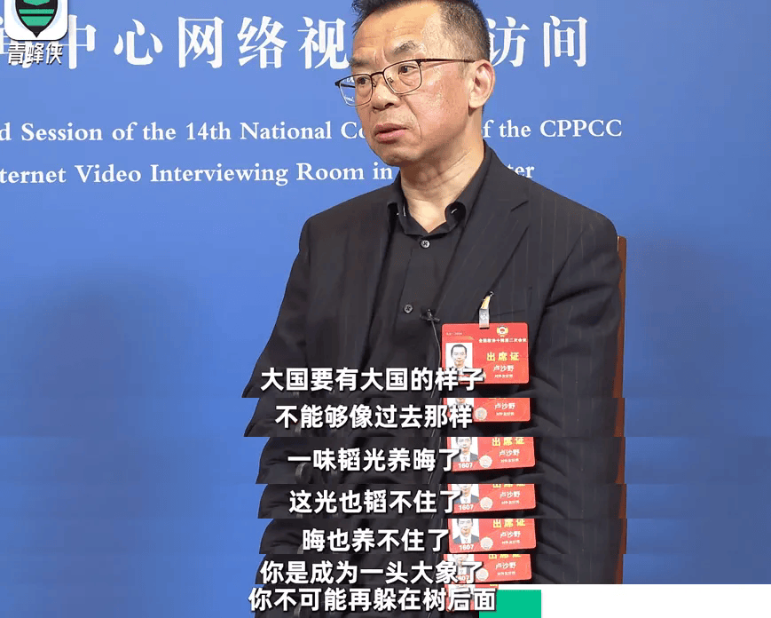 “在中國比較貧窮落後的時候,西方國家跟我們打交道是俯視,現在基本上是平視,個別情況下甚至是仰視,大國要有大國的樣子,不能夠像過去那樣一味的韜光養晦了,這光也韜不住了,晦也養不住了,你是成為一頭大象了,你不可能再躲在樹後面。”