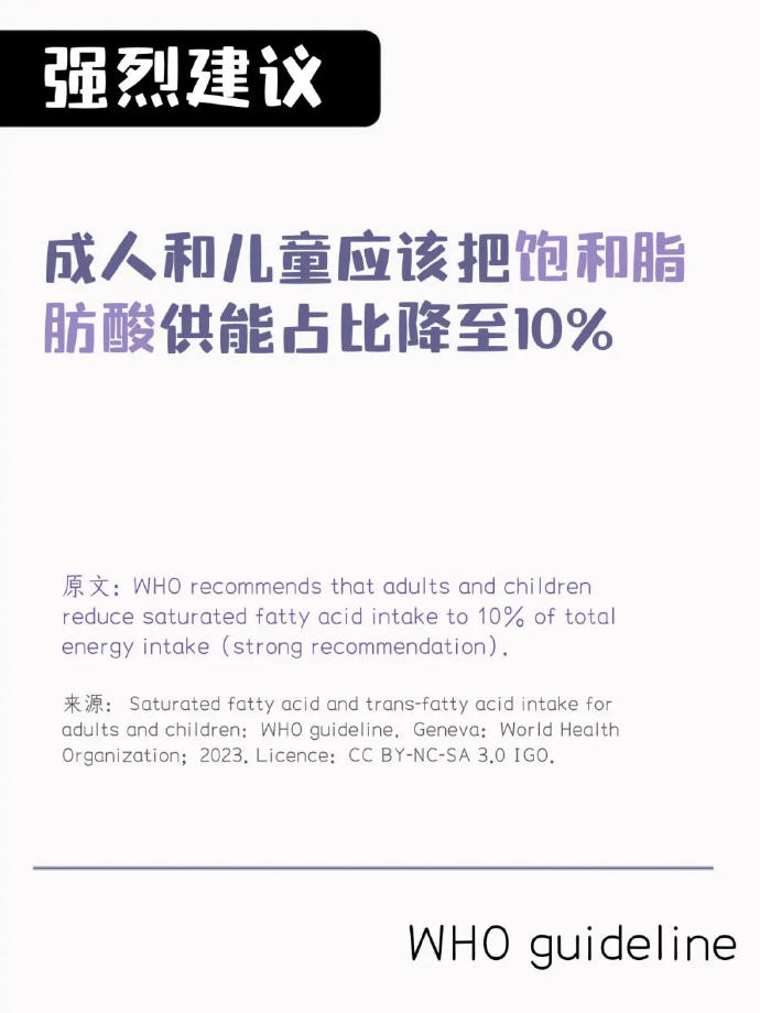 無論是世界衞生組織還是各國的膳食指南(包括美國的膳食指南,美國心臟學會的指南等),都在強調要限制飽和脂肪。像我國的居民膳食指南就建議飽和脂肪酸的攝入量控制在總脂肪攝入量的 10% 以下。世界衞生組織 2023 年發佈的指南,也是強烈建議成人和兒童都應該把飽和脂肪酸供能比控制在 10% 以內。