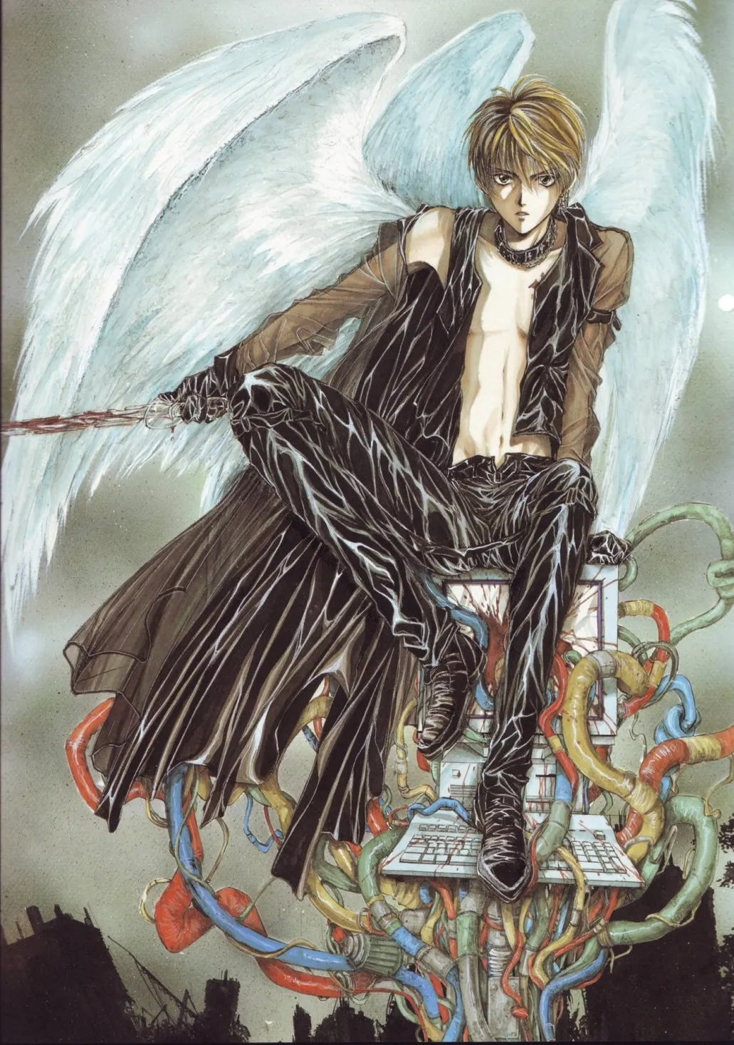 比如《天使禁獵區》的神界科技已十分發達,上帝是類似機器人的外表,賽博朋克風格的電子硬件和管線隨處可見。