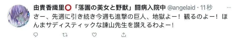 “這周的《進擊的巨人》也是地獄!真的很想誇讚有虐待狂傾向的諫山創老師!”