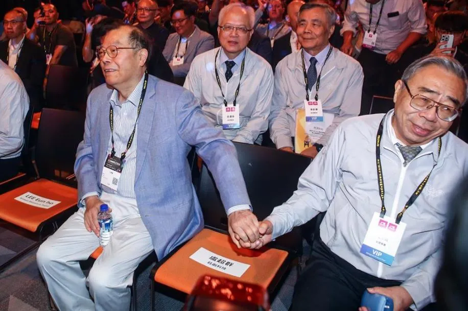 王文淵(右)與力積電董事長黃崇仁(左)聽AMD董事長蘇姿豐演講
