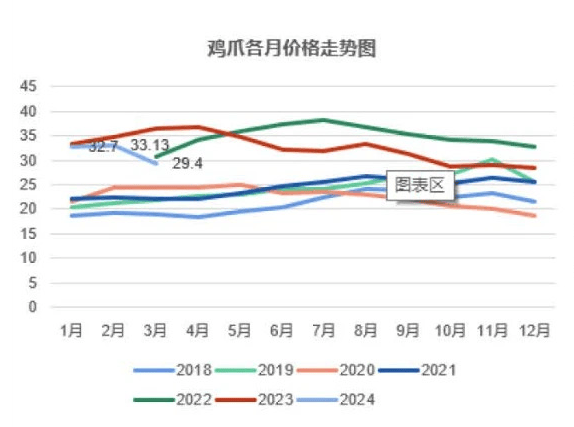 回顧這幾年的市場行情,相比2020年、2021年的低位,雞爪價格上漲了近50%。