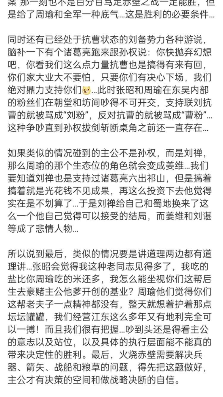 周瑜自己很清楚實際情況的嚴峻性,畢竟劉備那邊子午谷奇謀被打成了祁山對峙。私下週瑜和張昭喝酒也不避諱這些短板,但周瑜也是出於公心,也會和張昭説“你放心,我知道江東父老湊錢置辦這些家當不容易,如果主公拍版要戰,我一定全力打贏,不辜負大家的期待,只要第一批5000精兵登上曹船我就把我的帥旗插上去”。比起民間以為的,周瑜與張昭的分歧其實可能實際小於周瑜A與周瑜B,可能看似是敢不敢死人,戰法區別,實質上既有誰上三國演義的問題,也有其他不足為外人道的問題。回過頭畢竟周瑜與張昭在領到決心後都有事幹都不能掉鏈子誰沒事非要拆對面的台,畢竟大家在一個台子上,戰車啓動誰也別想下車。