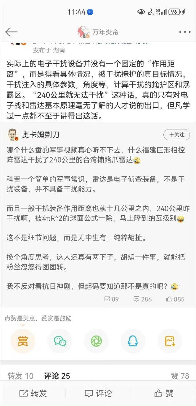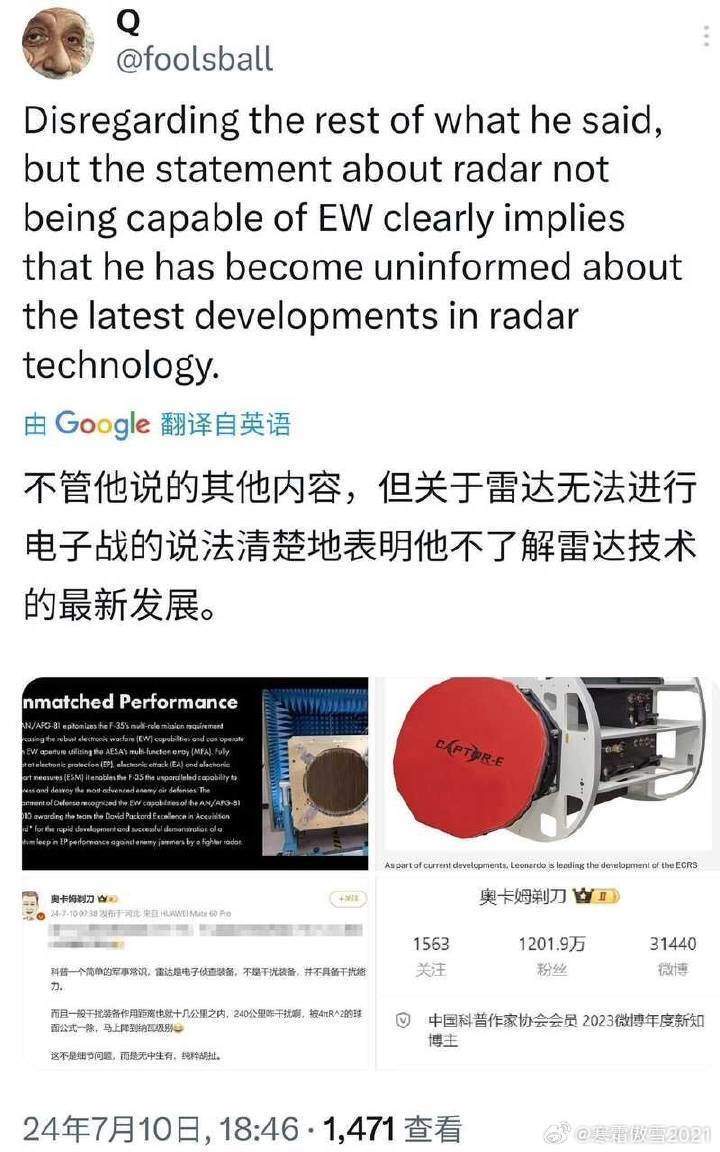 🔻圖1 某大V一上來就連續爆了三個典,第一是“科普一個簡單軍事常識:雷達是電子偵查設備,不是干擾設備,不具備干擾能力”。