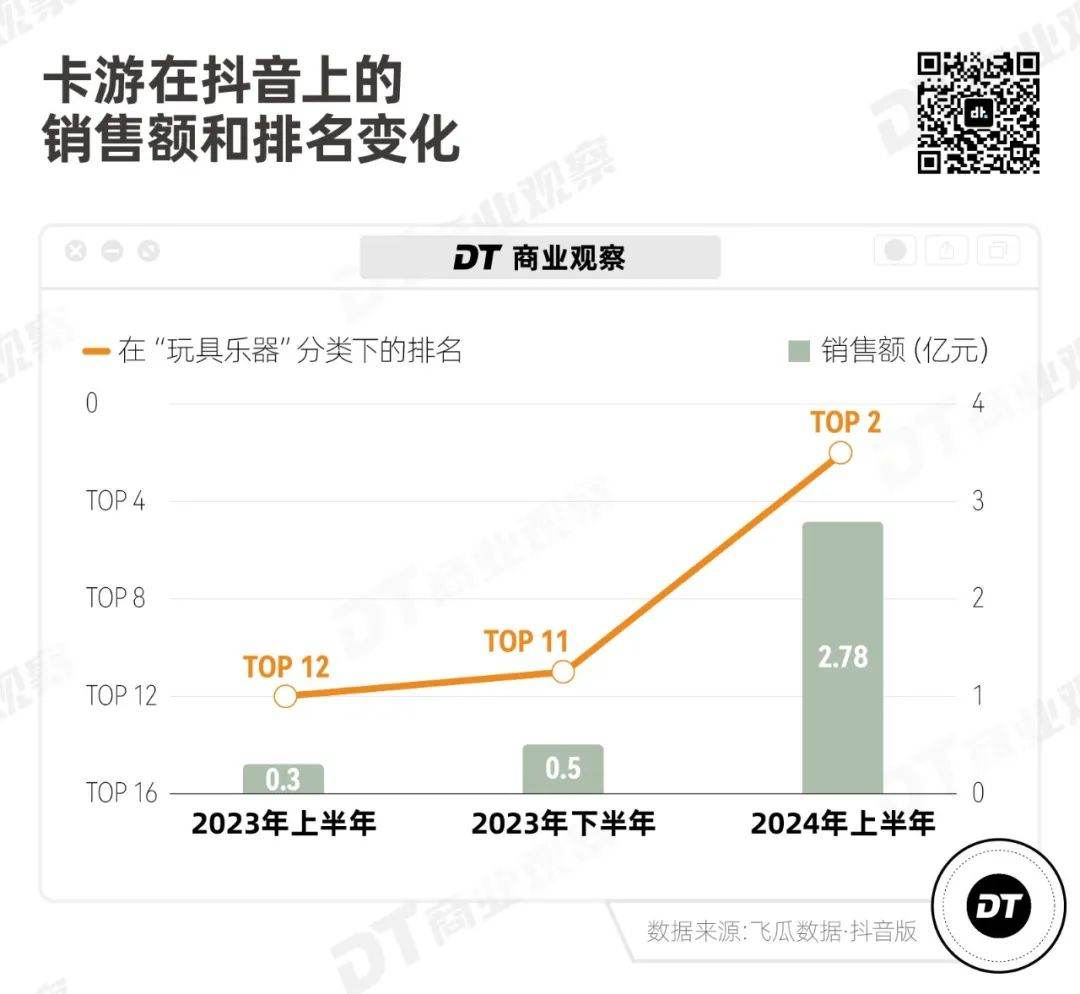**卡牌,成為繼盲盒、穀子後的潮玩圈新頂流。**在小紅書上搜索“拆卡”,近一個月相關筆記數達到3萬。在抖音,頭部卡牌公司卡遊在2024年上半年的銷售額達到2.78億,比2023年全年多了近2個億,排名也衝上第二名,僅次於泡泡瑪特。