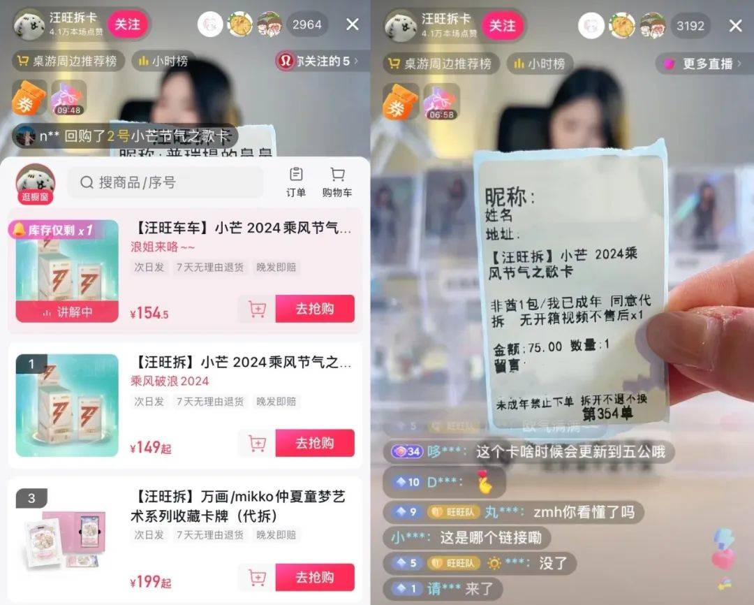 這也是為什麼有一部分人不選擇直接在淘天等電商平台上直接買卡寄回家,而是選擇在直播間下單。在眾目睽睽下開出的卡,往往會被賦予更多的滿足與價值。