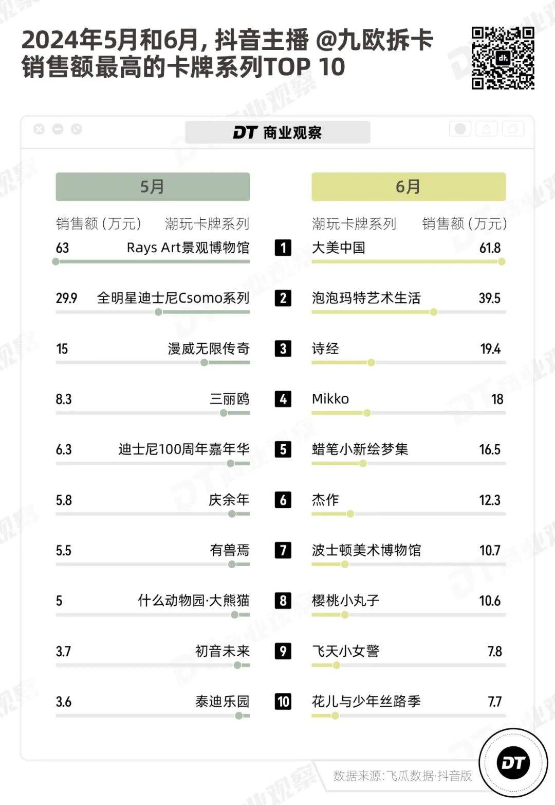 以 @九歐拆卡 抖音直播間為例,今年5月和6月銷售額最高的TOP 10卡牌都是不一樣的系列,5月還是迪士尼、漫威、三麗鷗和慶餘年系列的天下,6月就變成了大美中國、泡泡瑪特、Mikko、蠟筆小新和櫻桃小丸子等。