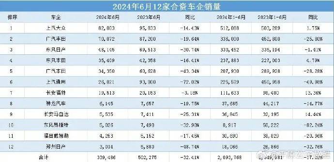 6月單月,12家合資車企銷量同比,全部下跌!上汽通用下跌72.02%,廣汽本田下跌43.34%,東風日產下跌30.74%,1-6月累計,12家合資車企銷量同比,8家下跌!上汽通用下跌49.98%,廣汽本田下跌28.28%,廣汽豐田下跌25.80%。