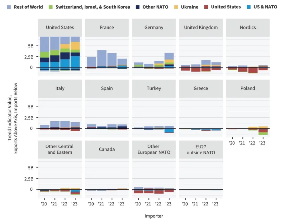在需求彙總、互操作性、採購協調與合作方面,北約已取得了一定的進展。自2023年7月以來,北約支持和採購局(NSPA)已經簽訂了多項合同,涉及彈藥、愛國者導彈和炮彈的聯合採購。此外,盟國還加強了多國能力合作,北約的多角色油料補給運輸機隊(MRTT-C)達到初始作戰能力便是這一進步的體現。如圖4所示,傳統歐洲生產商增加了在歐洲內部的貿易,而波蘭的全來源進口戰略顯著促進了歐洲大陸的武器貿易。
