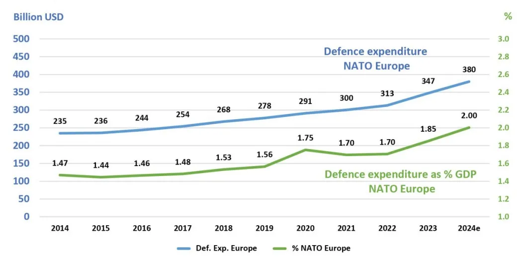 圖 1:歐洲的北約國防開支(2014-2024年,單位:十億美元)