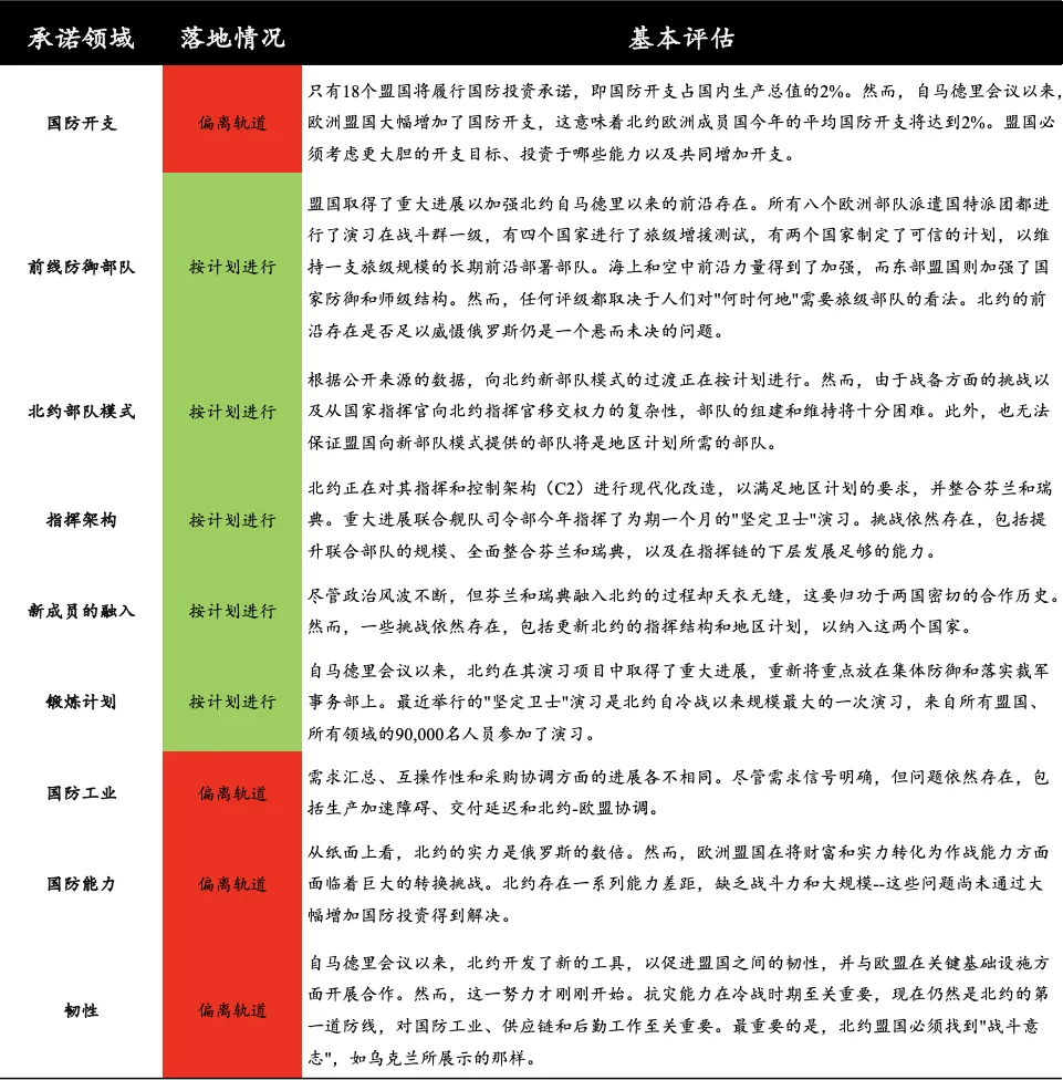 注:由於北約盟國在馬德里做出的承諾並未安排在華盛頓完成,因此採用了“按計劃進行 ”或“偏離軌道”的簡單評級,正如一份分析報告所説“北約加強防禦和威懾的征程才剛剛開始”。
