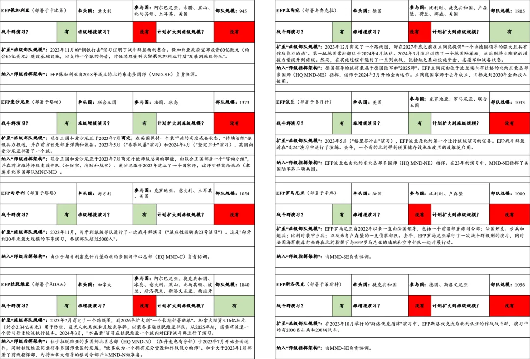 北約在加強前沿防禦方面採取了重要措施,核心是組建了八個前沿防禦戰鬥羣。這些戰鬥羣由一個框架國家牽頭,彙集了來自不同盟國的部隊。以下是根據最新數據對每個戰鬥羣情況的概述,並特別關注它們在實現馬德里峯會上作出的兩項關鍵承諾方面的進展:一是將每個戰鬥羣的規模擴大至“旅級部隊”(最多5000人);二是構建“師級架構”。