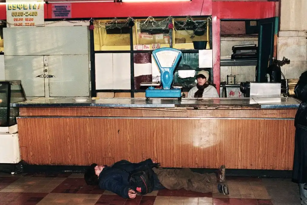▲1992年1月6日,一名醉酒男子躺在莫斯科卡贊斯基火車站的小賣部內。