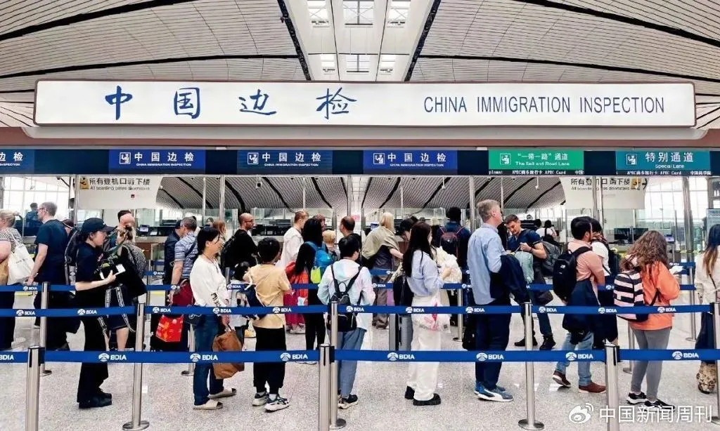 7月5日一早,來自英國的遊客Alex降落至北京大興機場,計劃中轉後前往中國香港參加朋友的婚禮。這是他第一次來中國,在朋友的推薦下,他選擇辦理144小時落地免籤,開展為期5天的旅行。“平時我不太有機會能來到世界的另一邊,所以我想,這次先去紫禁城和長城逛一逛,一定會非常有趣。”Alex告訴《中國新聞週刊》,因為落地後才能確認手續,出發前他有些緊張和擔心。在大興機場設置的獨立144小時臨時入境許可申請區域,Alex填寫完臨時入境外國人入境卡,前往相關窗口接受審核後,便能獲得臨時入境許可簽發。飛常準App顯示,當天,大興機場共有34個進港國際航班;在上海浦東、廣州白雲、北京首都機場,則分別有232個、117個和93個。據大興機場邊檢站數據,今年以來已累計為2.6萬餘名外國人簽發過境臨時入境許可,其中籤發京津冀144小時過境臨時入境許可1.6萬人,較去年同期增長20倍。大興機場邊檢站邊防檢查處副處長李思雨告訴《中國新聞週刊》,目前,機場口岸日均申請144小時免籤的外國人約100名,高峯時期每日達200人。“今年3—4月迎來高峯,最多時會出現一個航班30名遊客集中申請的情況,為此我們劃定了專用候檢區,增設叫號機和等待座椅。同時也拍攝了一則英語指南視頻發佈在外媒,解釋辦理流程。”去年以來,我國先後對法國、德國、澳大利亞等15個國家試行單方面免籤政策,新增與新加坡、泰國等7個國家互免簽證。自去年11月以來,位於18個省(自治區、直轄市)的38個對外開放口岸,已對54個國家人員實施了72/144小時免籤政策。