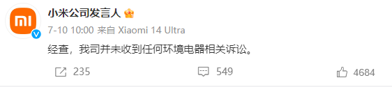 隨後,小米方面在7月10日硬氣回應:經查,我司並未收到任何環境電器相關訴訟。