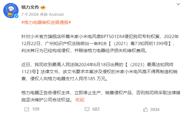 7月9日晚間,據“格力文傳”官微消息,近日,格力電器收到最高人民法院2024年6月18日出具的【(2023)最法知民終1123號】法律文書,該文書要求本案涉及侵權的米家小米電風扇不得再製造和銷售,侵權人向格力電器支付人民幣185萬元。
