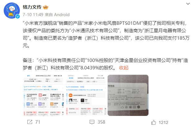 格力方面見招拆招,再次發文回應,稱“小米官方旗艦店”銷售的產品“米家小米電風扇BPTS01DM”侵犯了公司相關專利,該侵權產品的委託方為“小米通訊技術有限公司”,製造商為“浙江星月電器有限公司”,該公司已向格力電器支付185萬元。