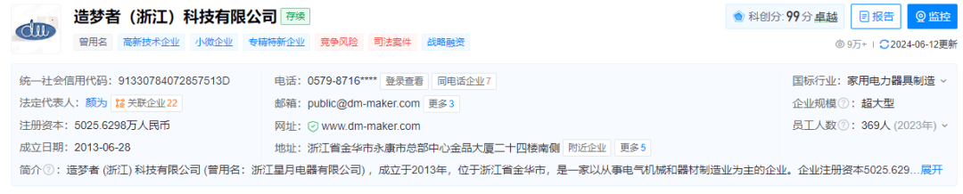 根據天眼查相關信息顯示,星月電器已改名為“造夢者(浙江)科技有限公司”,該公司的經營範圍涵蓋家用電器研發、製造、銷售;電機及其控制系統研發等,2018年進入小米生態鏈。