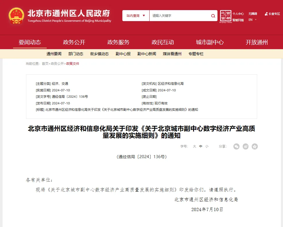 7月10日,北京市通州區經濟和信息化局印發**《關於北京城市副中心數字經濟產業高質量發展的實施細則》**。