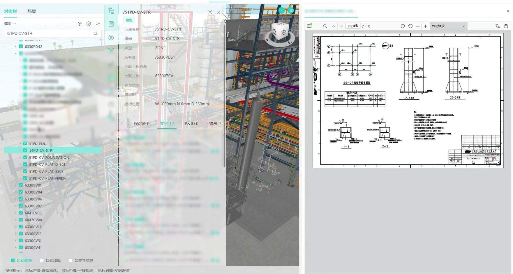 通過挖掘數據的內在聯繫,建立模型與數據、數據與數據間的關聯關係。在無需專業設計軟件的情況下,用户點擊對象模型即可查看該模型關聯的對象屬性數據或相關圖檔,實現二三維聯動。用户還可直接在瀏覽器端查看、批註與檢查文檔,查詢文件和生成報告,有效提升企業各系統間數據集成度。
