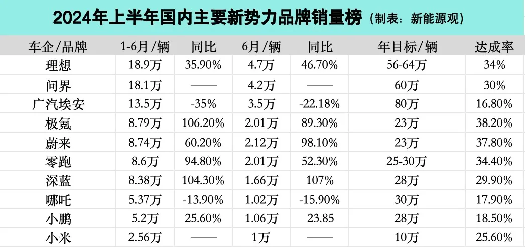 2024年前6個月小鵬汽車累計銷量同比去年同期上漲25.6%的數據確然向好,有市場回暖跡象,但小鵬汽車的“對手”們並不會“原地踏步”等待追趕。2024年1-6月新勢力銷量排行榜中,理想、蔚來、零跑等多家品牌均現同比大漲,分別為35.9%、60.2%、94.8%。