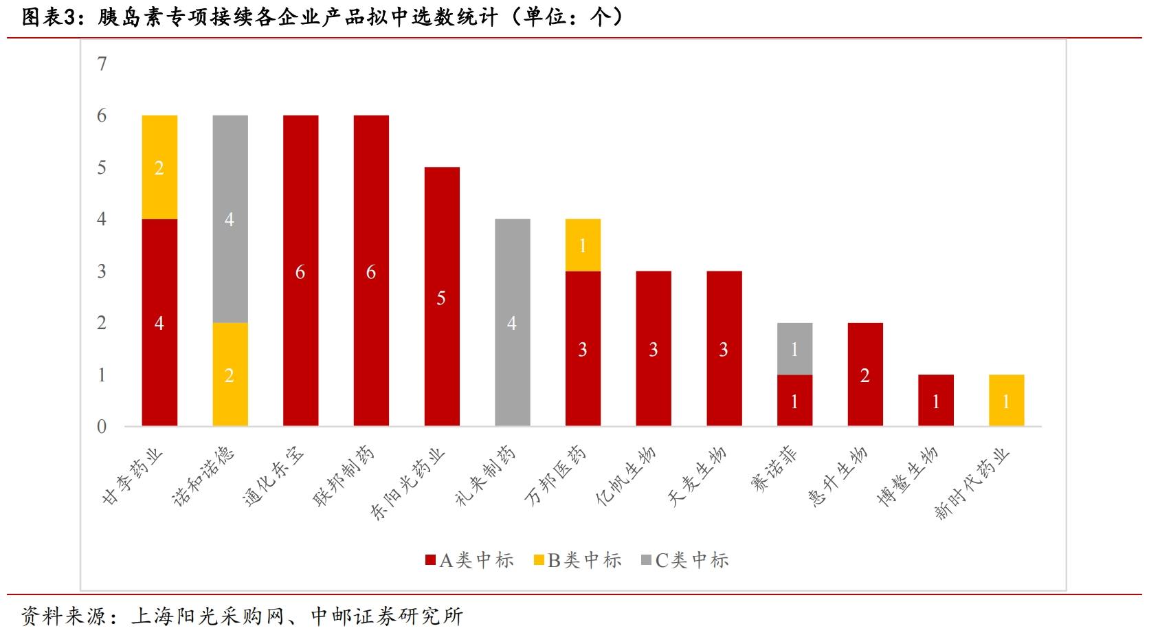 此外,上述拿到6個產品中標的企業中,通化東寶、聯邦制藥均為A類中標,甘李藥業4個A類中標、2個B類中標,諾和諾德2個B類中標、4個C類中標。