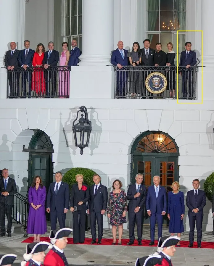 然後有人,就發現:在神田真人操作干預匯市之前,拜登拉着大家,要在白宮,拍一張北約加上“夥伴”的全家福照片時,岸田的神情,非常古怪!