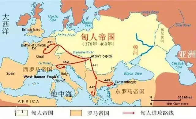 巧合的是,北匈奴消失後不久,亞歐大陸出現了一次民族大遷徙。其中一支叫做匈人的民族向西遷徙至歐洲大陸腹地,一直推進到羅馬帝國的邊境。