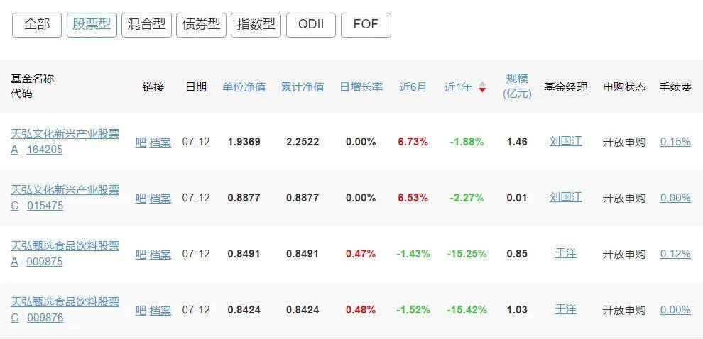 不過,根據天天基金網的數據,截至7月12日,天弘基金股票型基金僅有4只,近一年收益率全部為負。