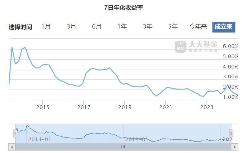 但從2015年開始,天弘餘額寶的收益持續走低,7日年化收益率跌至3.5%。2016年至2019年裏,繼續跌到2.5%左右。2020年至2023年,天弘餘額寶7日年化收益率更是跌破2%關口,2022年11月中旬最低甚至達到1.292%的收益率水平。