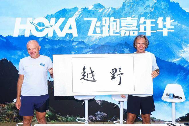 不僅如此,對於越野跑的熱愛,同樣深深印刻在了品牌兩位創始人的心中——整個分享環節,「誕生於山脈地帶」是他們在談到彼此和HOKA品牌時,會反覆強調的重點;當被要求用中國傳統毛筆進行書寫時,二人寫下的也並非自己創立品牌的名字,而是「越野」二字。