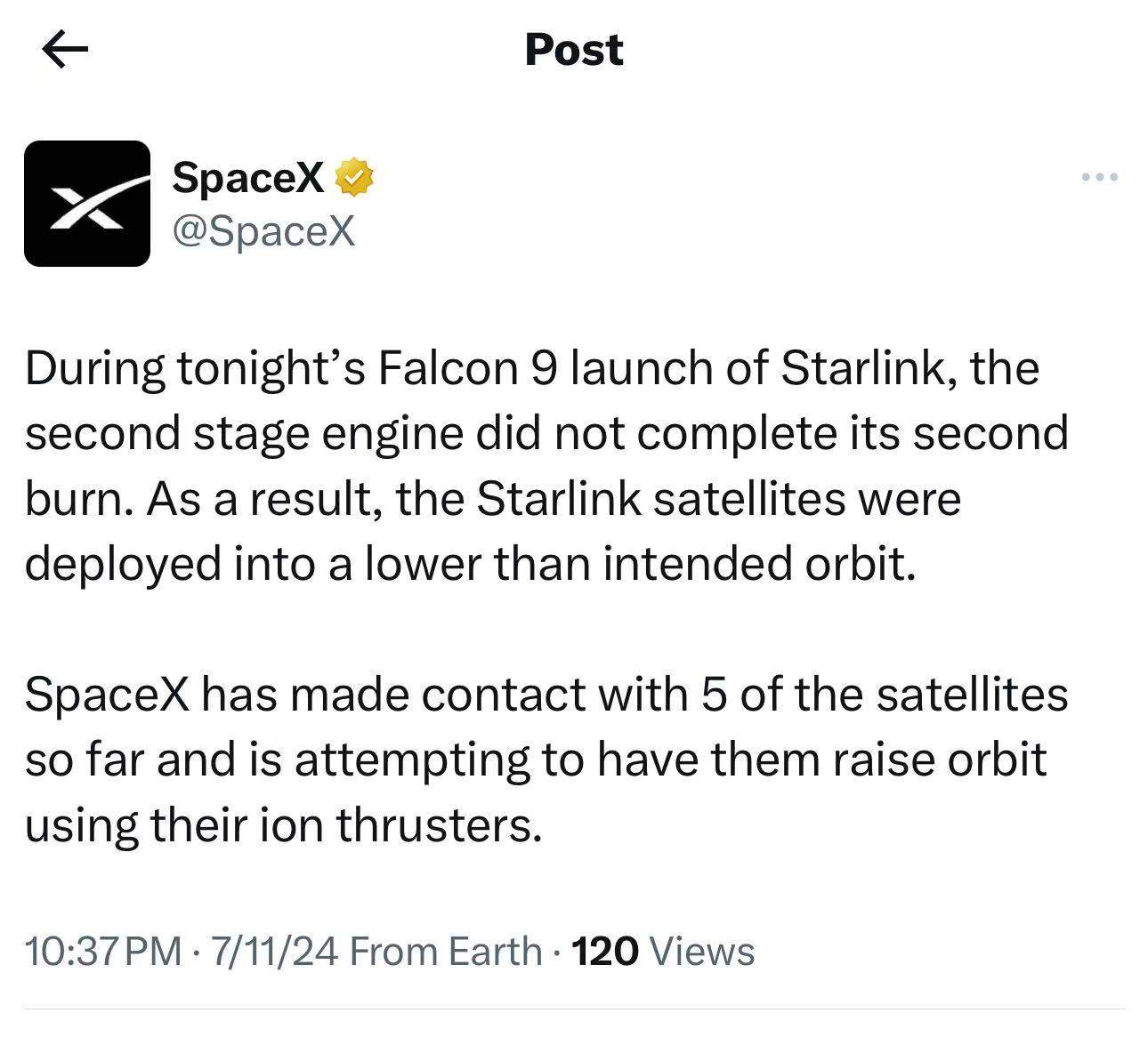 馬斯克確認:今天發射星鏈G9-3的獵鷹9號火箭二級真空梅林發動機,在二次點火以提高近地點時RUD(快速計劃外解體),目前原因不明,技術團隊今晚將審查數據以分析根本原因。