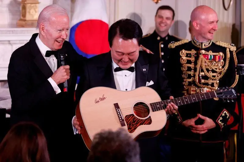 美日是怎麼看待韓國就不説了,先陪着岸田文雄給日本國旗鞠躬,再當着拜登的面深情獻唱《美國派》,這些事弄得就連很多韓國民眾都沒臉説,為此還專門給他編排了一首《尹錫悦之歌》。這歌我在之前的節目裏頭還放過來着,挺帶感的,個人感覺比所謂的K-pop好聽,感興趣的同志和朋友不妨去找來聽聽。