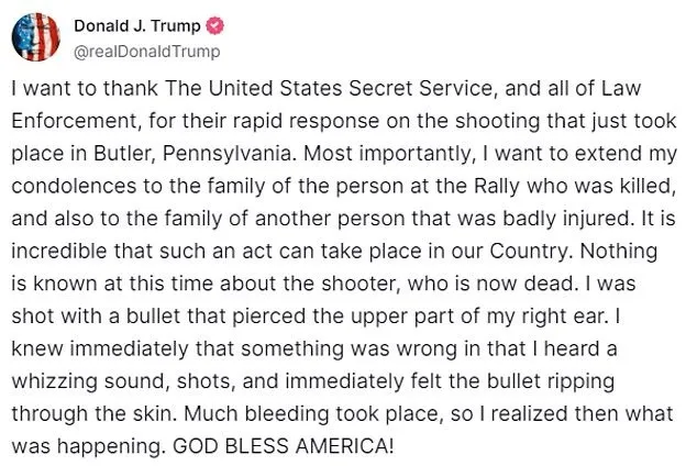 隨後川普在“真相社交(他自己的社交平台)”上發表聲明,證實自己被子彈擊中了。而非網傳的,子彈擊中了提詞器,他的耳朵被提詞器碎片劃傷。