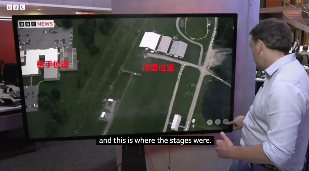 在現地踏勘上,不得不説,美國特勤局在特朗普演講地點的選擇上,還是頗有一套的,體現出了特勤局的工作水平,特朗普的演説地被選擇在巴特勒縣農用機場北側的一家名叫AGR International Inc.的公司旁邊的空地上,空地四周公路環抱,形成了一個邊長大約400米的空間,正好可以作為安保管制區域使用。而在演説現場的佈置上,特勤局巧妙地利用了現場的地形地物,北側由AGR International Inc.公司的兩棟連體廠房作為制高點,南側由巴特勒縣農用機場的一些輔助建築作為制高點,特朗普的背後除了人羣,還有三棟倉庫建築作為制高點,三個方向的制高點像城牆一樣,形成一個半包圍,正好將特朗普緊緊地包圍在中間。