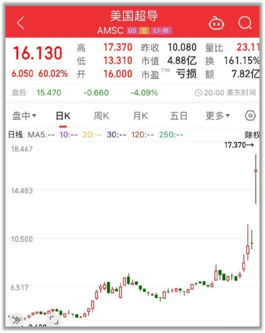 這個叫【美國超導】的股票先是盤前漲了百分之一百四十,收盤漲60%。
