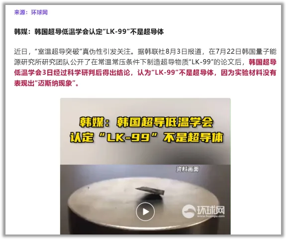 加上韓國人又出來認慫,説認定前幾天他們鼓搗出來的東西不是超導體。
