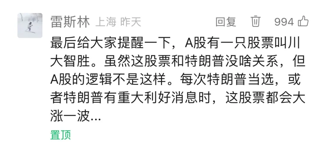 最後給大家提醒一下,A股有一隻股票叫川大智勝。雖然這股票和特朗普沒啥關係,但A股的邏輯不是這樣。每次特朗普當選,或者特朗普有重大利好消息時,這股票都會大漲一波…