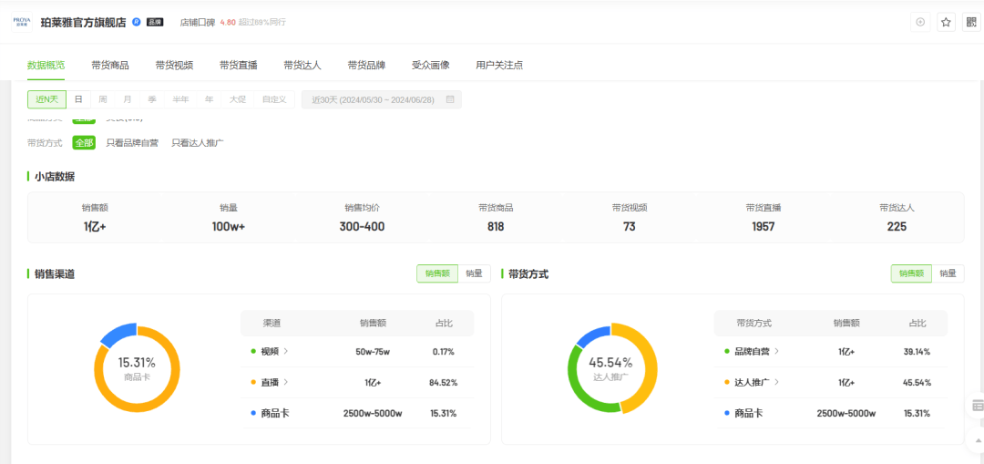 飛瓜數據顯示,珀萊雅、薇諾娜等國產大牌的自營直播間銷售佔比都在50%左右,有些品牌甚至達到60%以上。