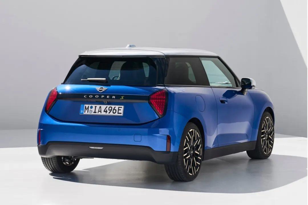 **以前 MINI 很多地方都設計的很圓潤,****新款純電 MINI 大量使用了直線的元素,**像方形的後視鏡、像用刀劃拉出來的下腰線、三角形的矩陣尾燈、中出排氣換成平直的後保險槓。。。