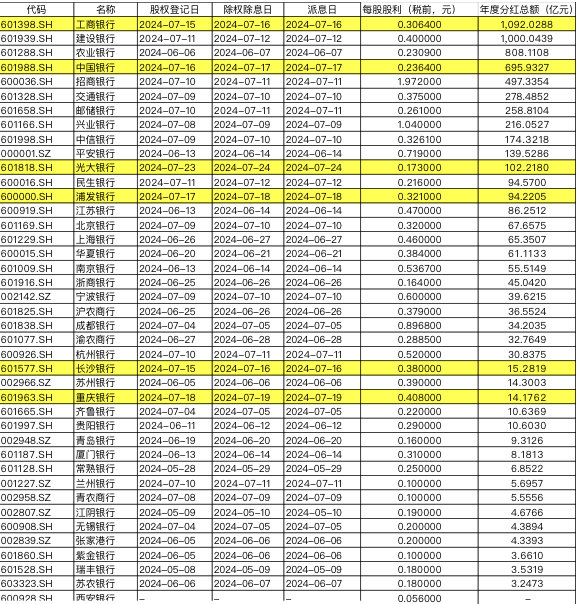 銀行業ETF(512820)緊跟的中證銀行指數(399986)成分股2023財年幾乎悉數分紅。當前,已有34只成分股累計分紅4,117.12億元。7月16日,分紅大户工商銀行將分紅1,092.03億元,工商銀行2021-2023年連續三個會計年度分紅超千億元,是名副其實“分紅王”!