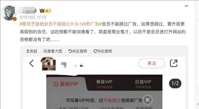 據不少網友吐槽,愛奇藝的基礎會員無法跳轉視頻片頭120秒廣告,有網友甚至直言「愛奇藝基礎會員不能跳廣告,那開會員的意義在哪?」