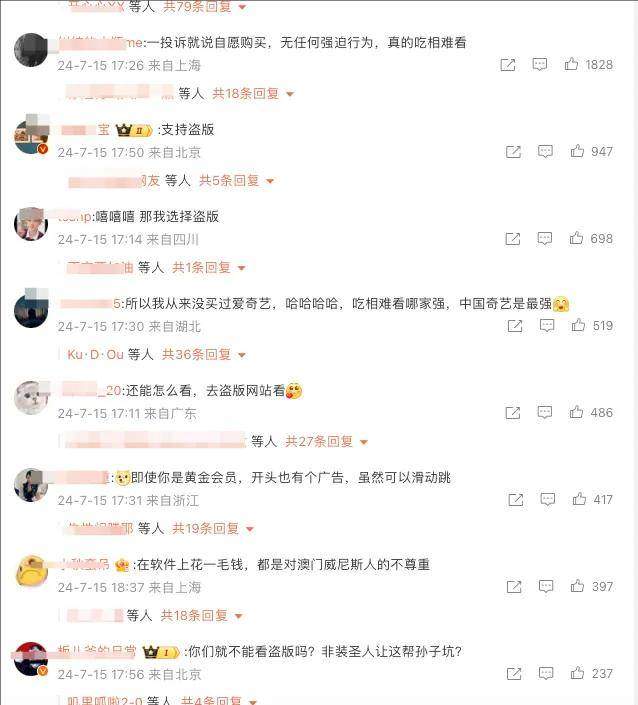 對於這樣的回應,熱搜評論區,盜版兩字成了高頻詞。「支持盜版」「還能怎麼看,去盜版網站看」「在軟件上花一毛錢,都是對澳門威尼斯人的不尊重」……